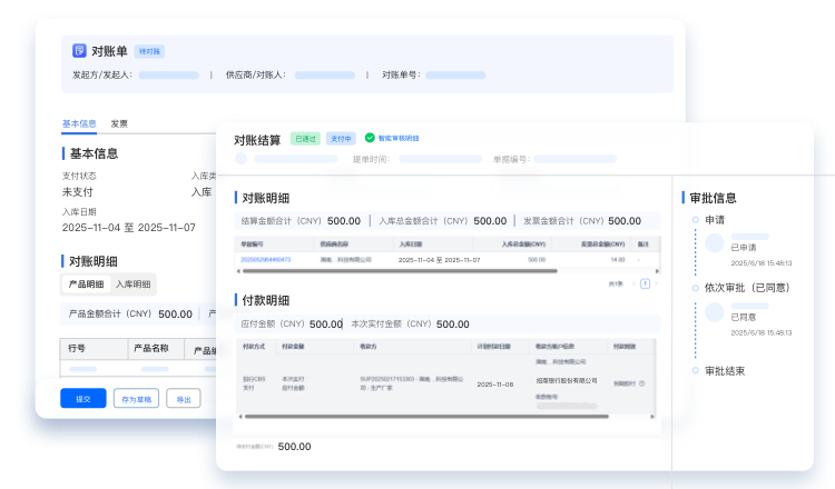 对账后可快速生成结算单,结算单自动关联对账单、入库单、发票,提高结算效率