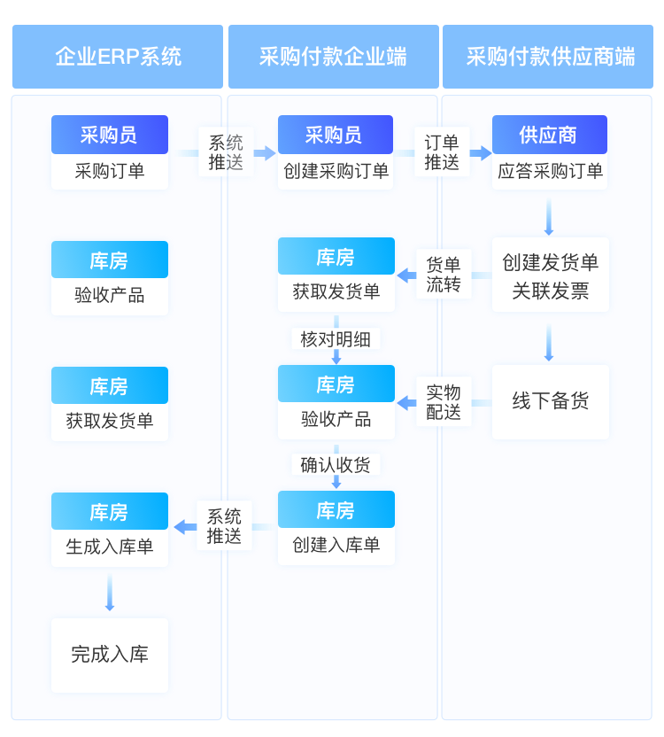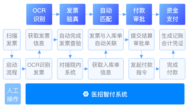 打通药品耗材库存管理系统(HIS、SPD)及财务系统,医院线上完成发票查验,发票匹配,单据提交、审批及支付,线上管理付款账期,凭证由系统自动生成,实现“货、票、账、款”一致性管理