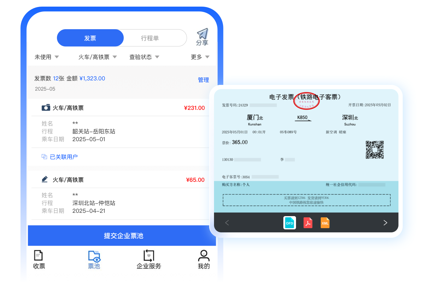 自动获取铁路电子客票XML、OFD、PDF格式的发票,确保发票附件符合企业电子档案归档要求,无需员工手工下载,财务在线即可查询铁路电子发票影像