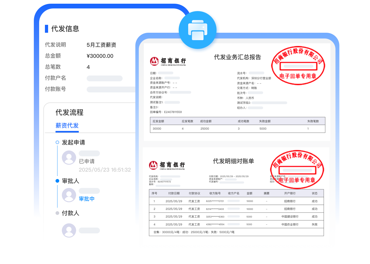 自定义设置经办人、审批人、付款人,灵活控制参与人薪资数据查看权限,支持在线获取电子银行回单