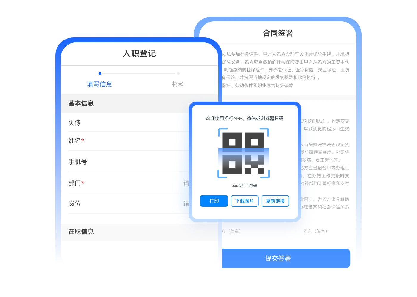 扫码批量入职,HR一键确认,信息自动同步花名册及档案,工资卡同步办理,入职极速达