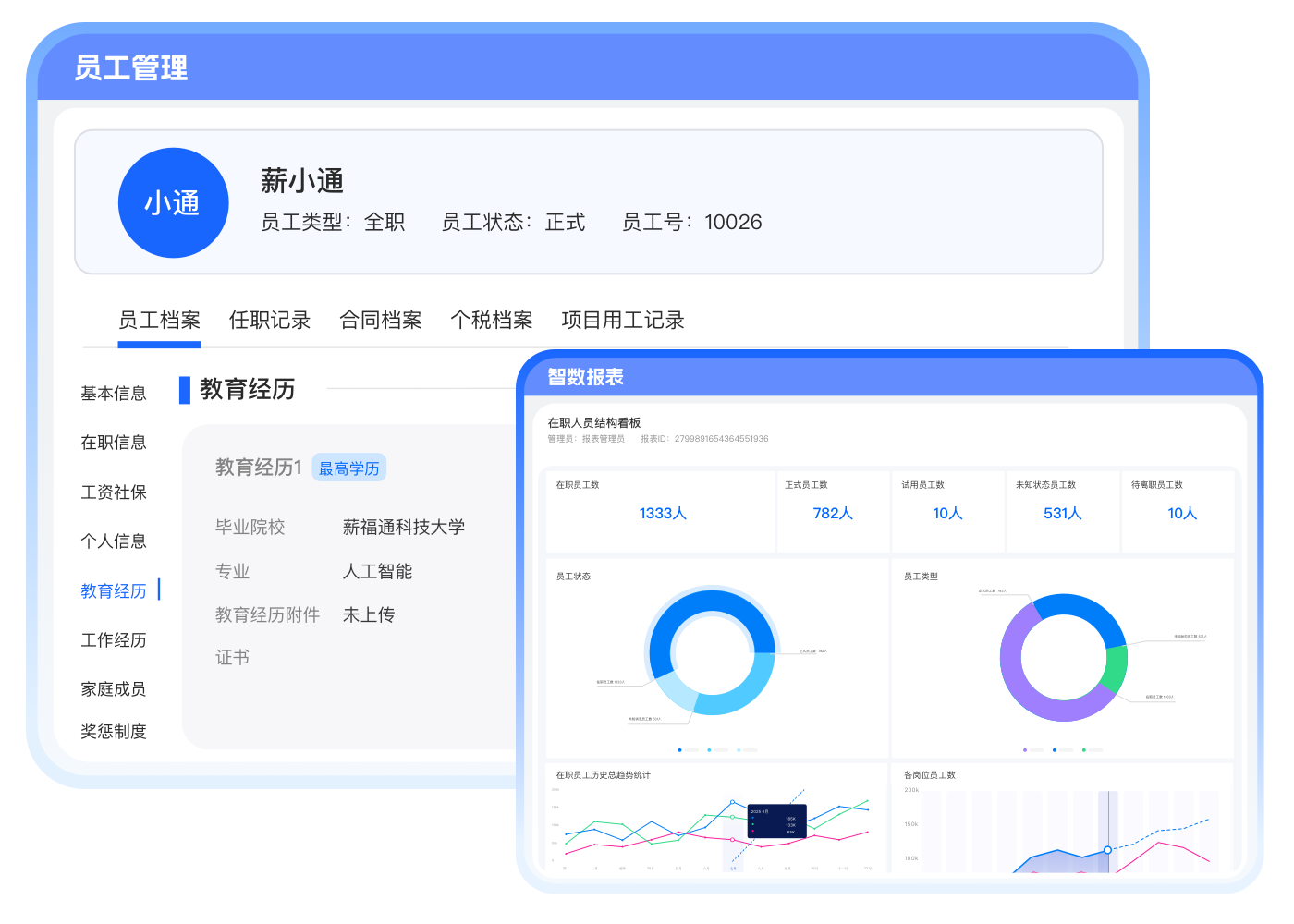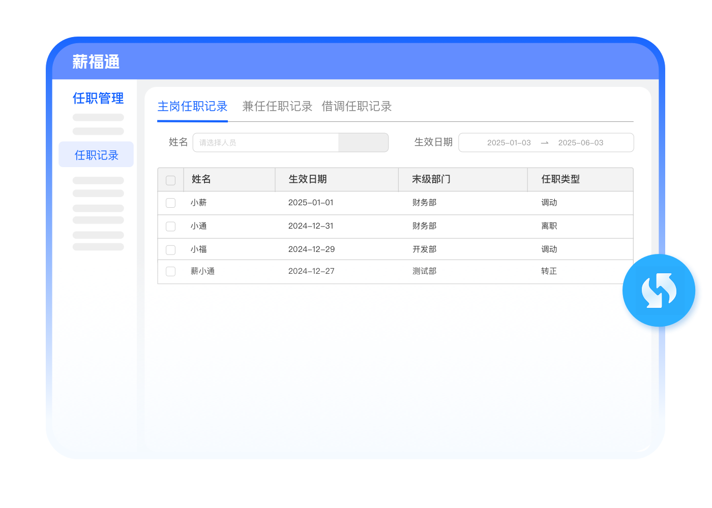 任职记录全程可溯,智能生成异动报表赋能决策;支持导入历史数据,完整记录员工生命周期