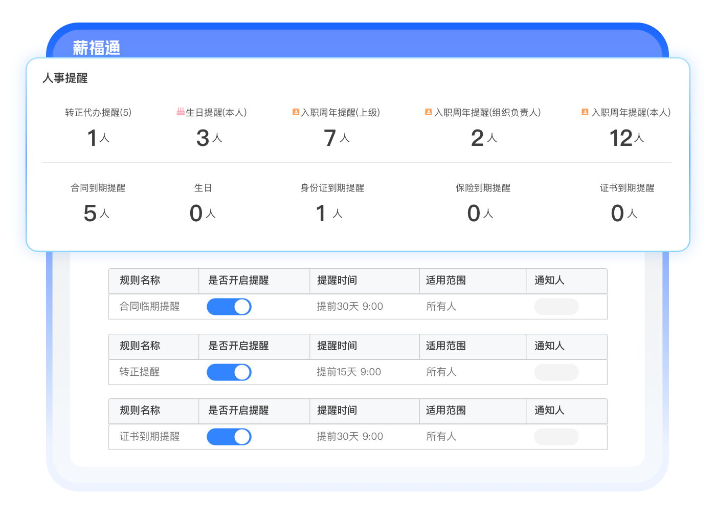 监控健康证、驾照、保险等资质到期,自定义提醒对象、时间,有效规避用工风险