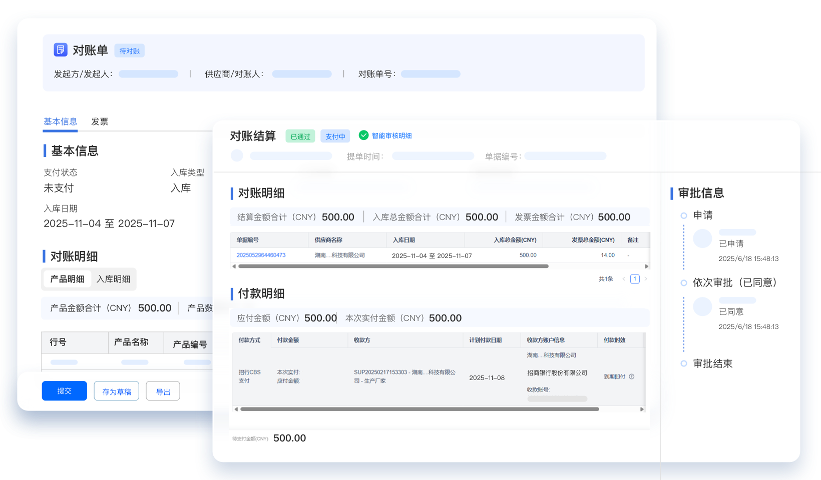 出入库单、客户对账单等快速按供应商拆分,并同步供应商确认,确保信息准确,数据留痕,按期完成结算