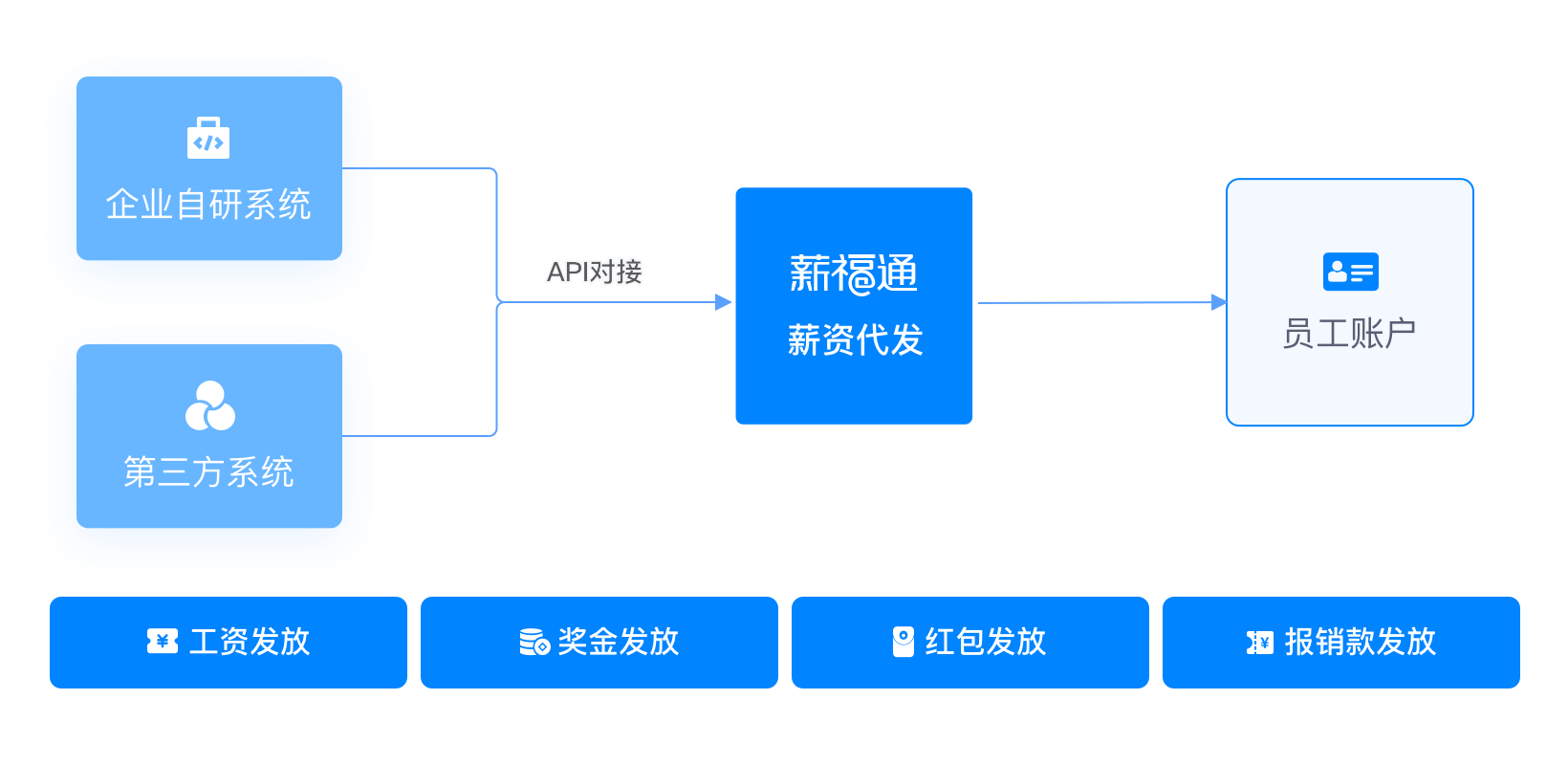 支持在薪福通或通过API对接企业内部系统,完成工资、奖金、报销款发放等代发全流程